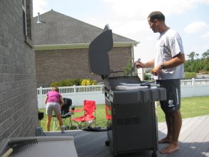 John and I headed up to Va. Beach on Friday to finish up the move in and do some cleaning from Irene. We got alot done, doors cleaned of sand and seeds, windows cleaned, lawn mowed and sprayed...good work! Jill and Dave came up early Sunday from Duck where they had been helping Dave's folks clean up the beach house for the last three days. Irene was not nice to Duck, but there was no structural damage to the Baird house, only sand and a very littered beach full of wood from docks, everything imaginable. They had gotten a lot of the food prep done while down there! Time for the last minute touches they haven't had time to finish....